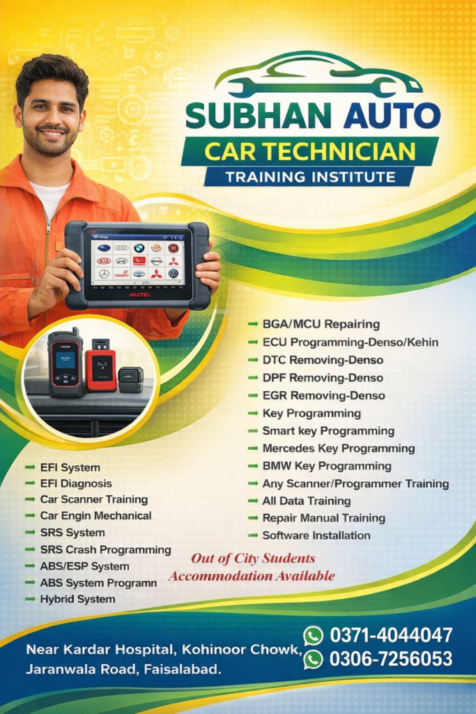 Subhan Auto Technician & Training Institute Faisalabad ka ek *modern automotive training center* hai jahan hum students ko *latest car technology, diagnostics, ECU programming aur hybrid systems* ki *hands-on practical training* provide karte hain.